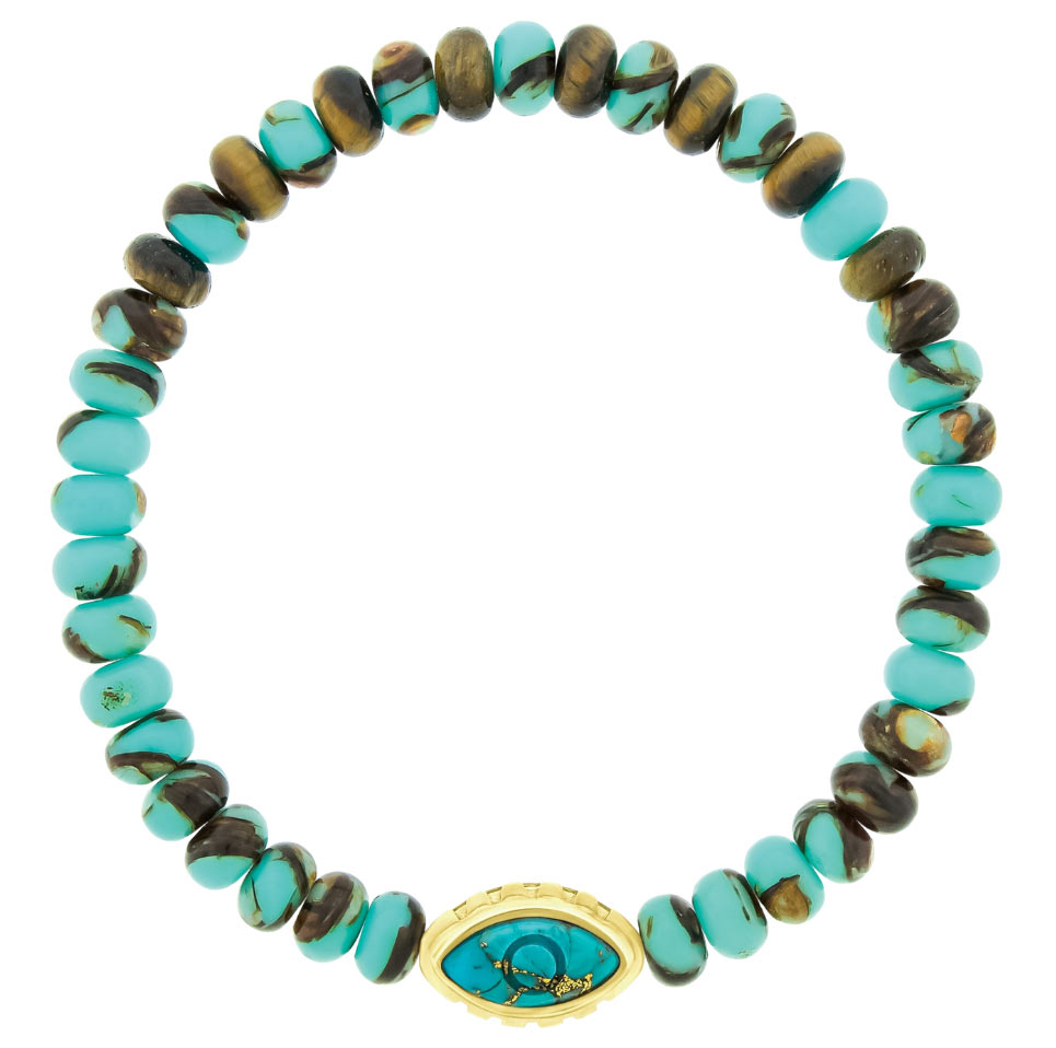 Luis Morais, The Eye of the Idol Bracelet and Multi-Oval Gemstone Chain Necklace / Crafted from copper jasper and tiger’s eye beads, the bracelet features a 14k yellow gold and engraved turquoise charm that channels protection, mystique, and refined strength. The necklace shimmers in 14k yellow gold with diamonds and vibrant gemstones, blending artistry and opulence in a fluid, sculptural design. A timeless statement of modern luxury. 1701 Sunset Harbour Dr. Suite 106, Miami Beach