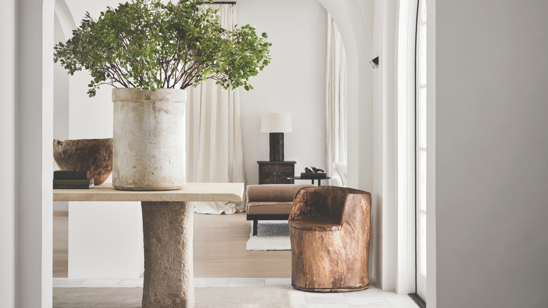 “I like mixing primitive things with contemporary pieces, rustic with polished, cool metal and stone with warm fabrics and wood, and beautiful objects and furniture from every time period so that rooms feel layered and timeless,” says Solomon, who believes every project should be bespoke and always collaborates with skilled artisans. Intimations of his artistic instincts and compositional skill begin to unfold in the arched foyer, where a rustic chair carved from an 18th-century stump contrasts with an alabaster vase from the 1930s and a branch-filled 1960s garden pot by Willy Guhl atop a sculptural hall table. In the living space beyond, a medley of iconic midcentury furnishings—a 1950s daybed by Charlotte Perriand recovered in hair-on horsehide, a pair of 1960s Pierre Jeanneret armchairs retrofitted in chocolate brown leather, and a quartet of French Deco lounge chairs by Jean Royère reupholstered in a dense bouclé—unites European high design from across the 20th century in a congenial ensemble accented with light fixtures and objects by contemporary masters like French visionary Joseph Dirand and British craftsman Alexander Lamont.