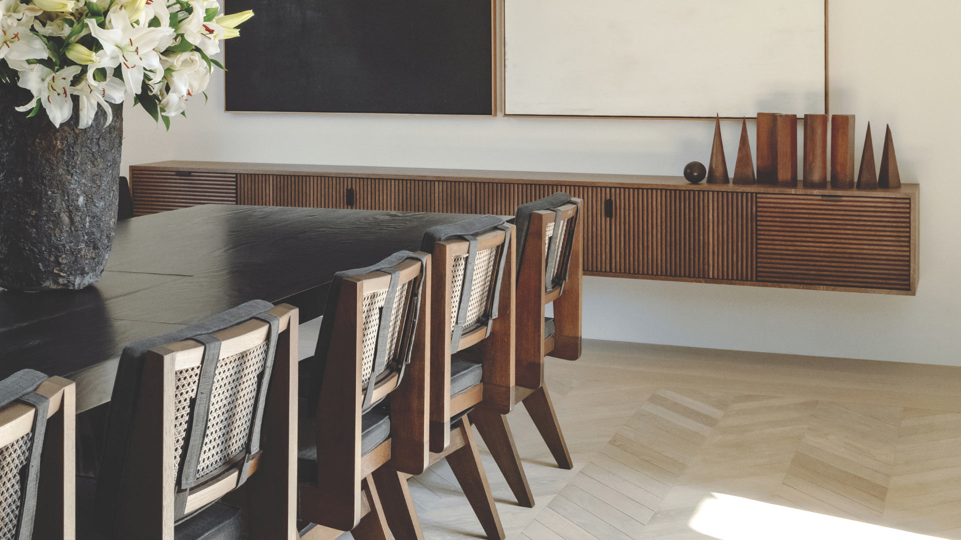 The nuanced neutral color palette—shades of gray, brown, black, and white—sets a soulful, meditative tone throughout, yet certain elements, such as the Rosso Levanto Italian marble—“like the color of merlot,” notes Solomon—in a powder room, shift the tempo here and there with occasional shots of complex color. Considered works of contemporary and vintage art, antique curios, and precious objects (many found in Parisian antiques shops) finish off rooms with notes of depth and dimension. In a region where interiors often are defined with bright colors and slick forms, Solomon’s subdued brand of minimalism offers a refreshing counterpoint—a soothing sensibility that speaks instead in low tones with deliberate gestures that subtly signal power and softly whisper luxury.