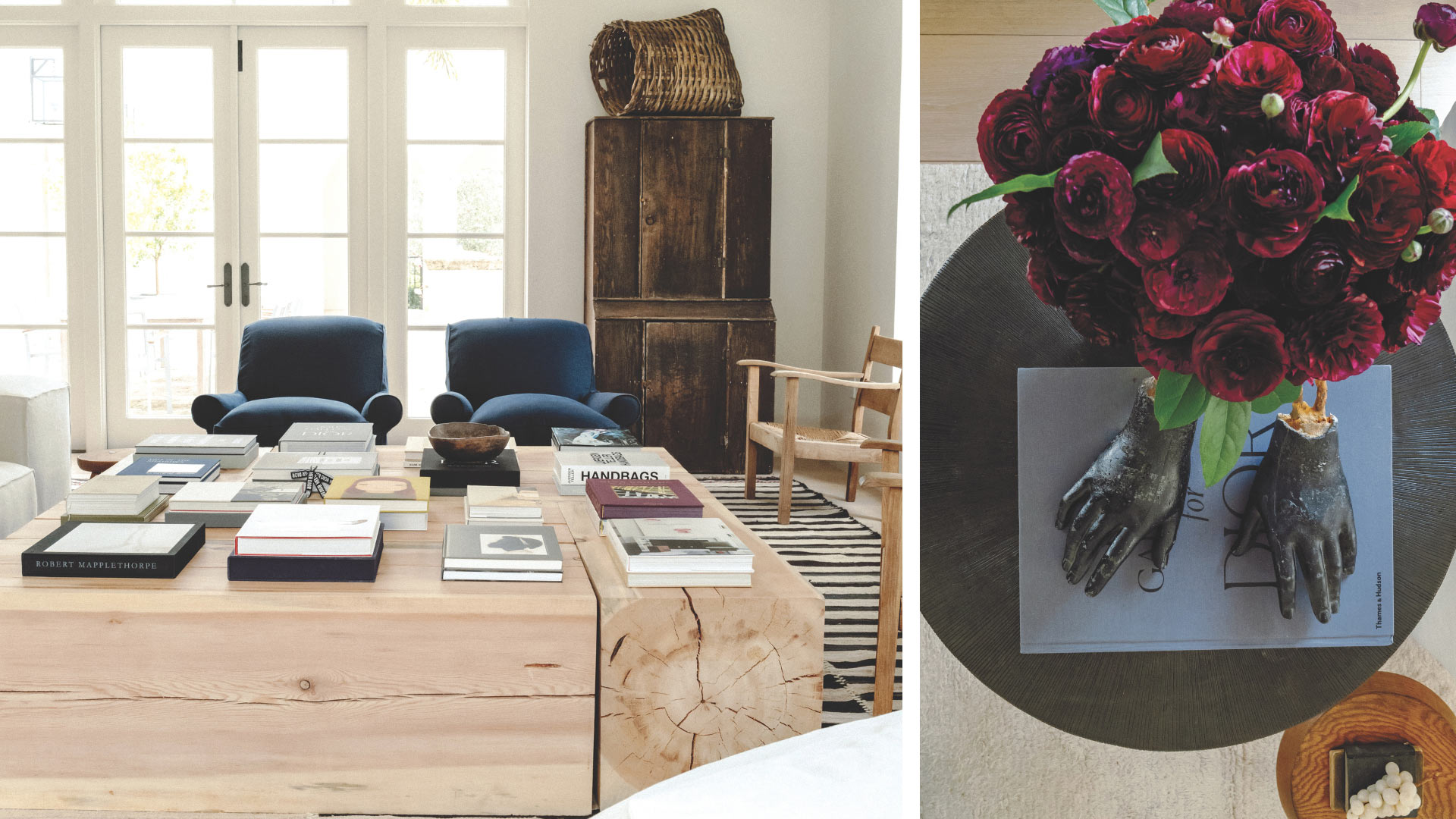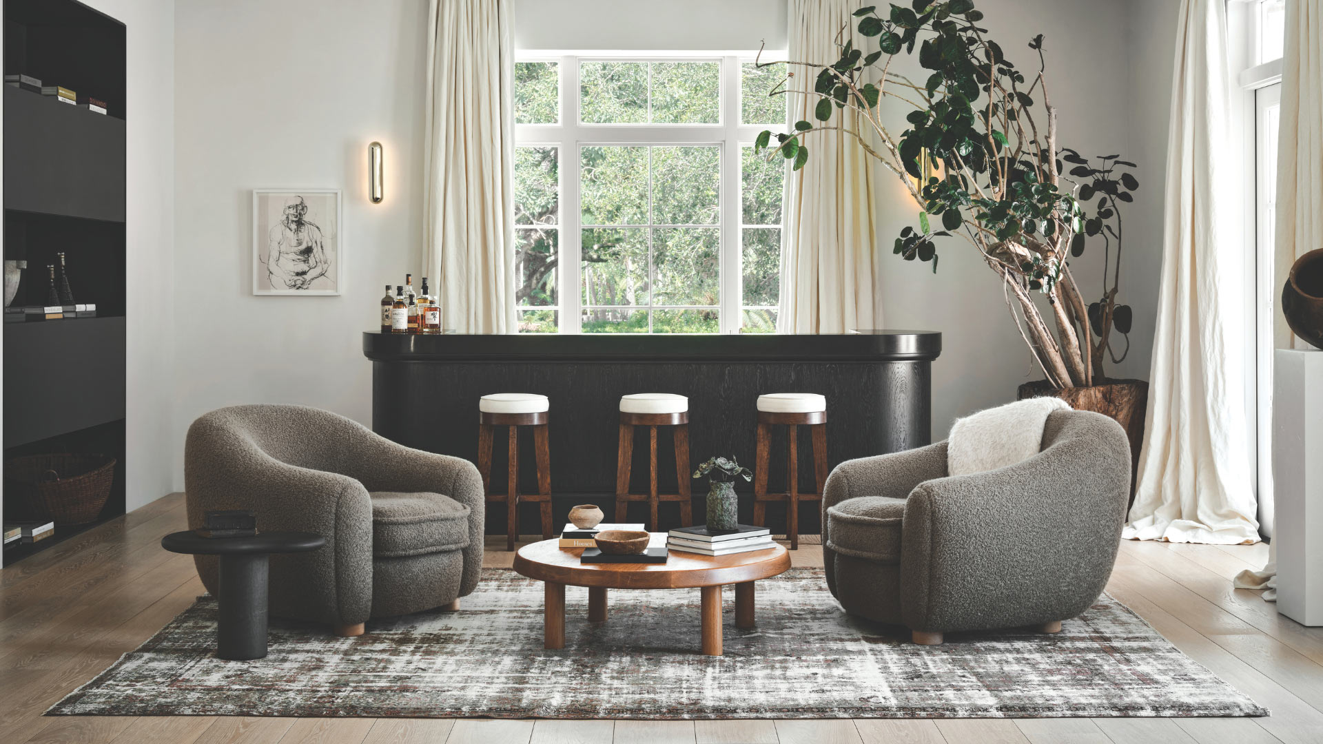 “I like mixing primitive things with contemporary pieces, rustic with polished, cool metal and stone with warm fabrics and wood, and beautiful objects and furniture from every time period so that rooms feel layered and timeless,” says Solomon, who believes every project should be bespoke and always collaborates with skilled artisans. Intimations of his artistic instincts and compositional skill begin to unfold in the arched foyer, where a rustic chair carved from an 18th-century stump contrasts with an alabaster vase from the 1930s and a branch-filled 1960s garden pot by Willy Guhl atop a sculptural hall table. In the living space beyond, a medley of iconic midcentury furnishings—a 1950s daybed by Charlotte Perriand recovered in hair-on horsehide, a pair of 1960s Pierre Jeanneret armchairs retrofitted in chocolate brown leather, and a quartet of French Deco lounge chairs by Jean Royère reupholstered in a dense bouclé—unites European high design from across the 20th century in a congenial ensemble accented with light fixtures and objects by contemporary masters like French visionary Joseph Dirand and British craftsman Alexander Lamont.